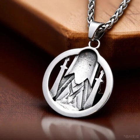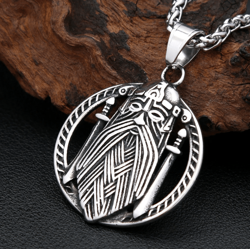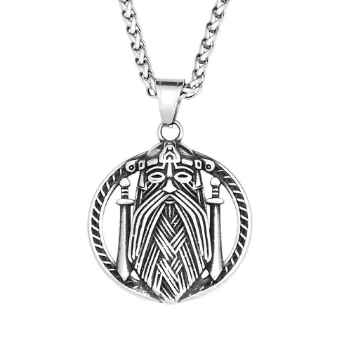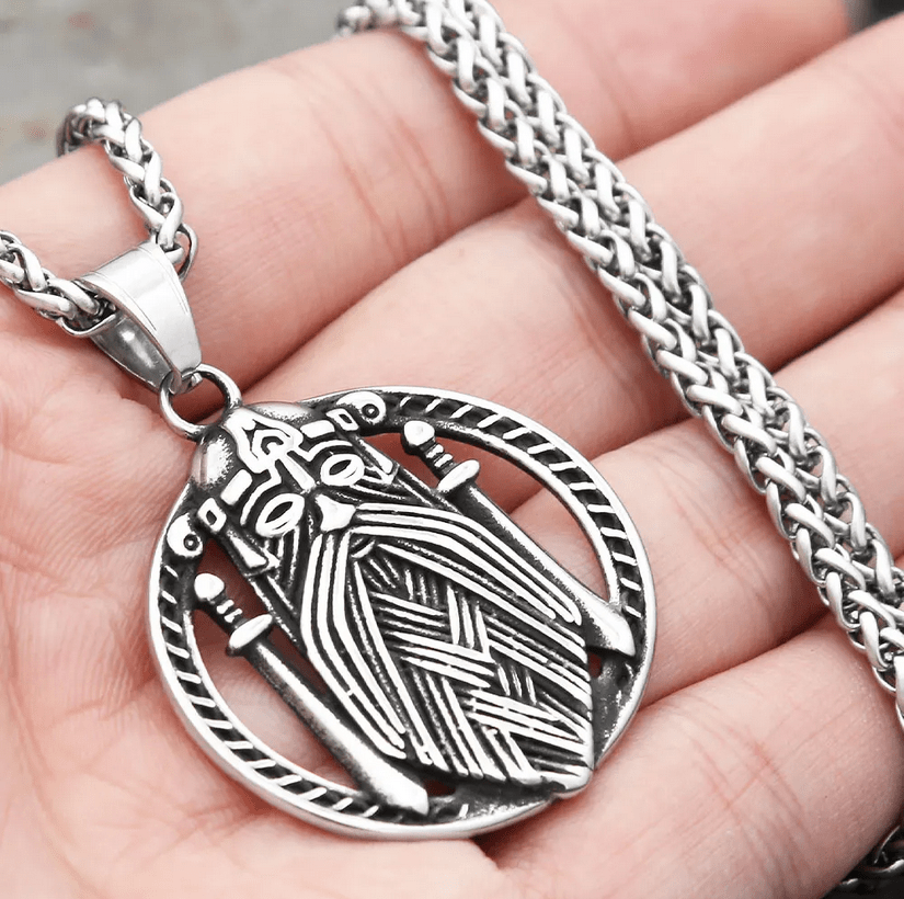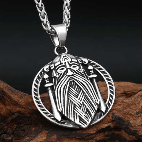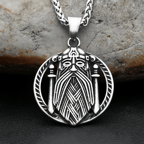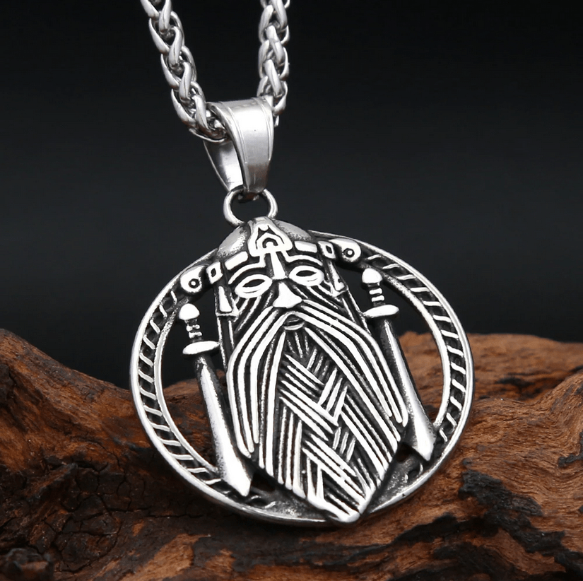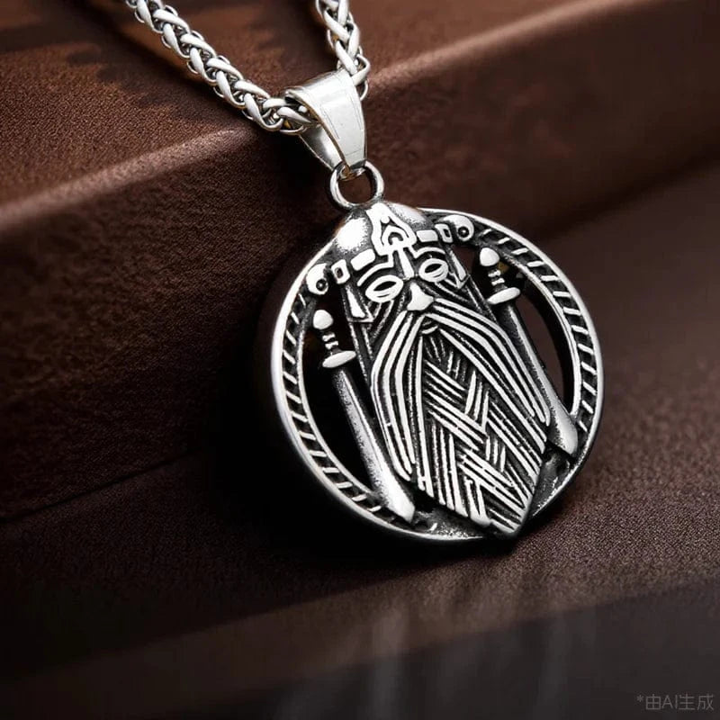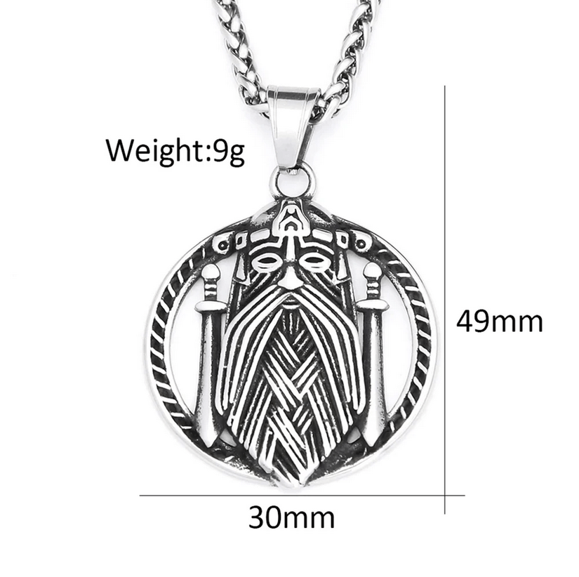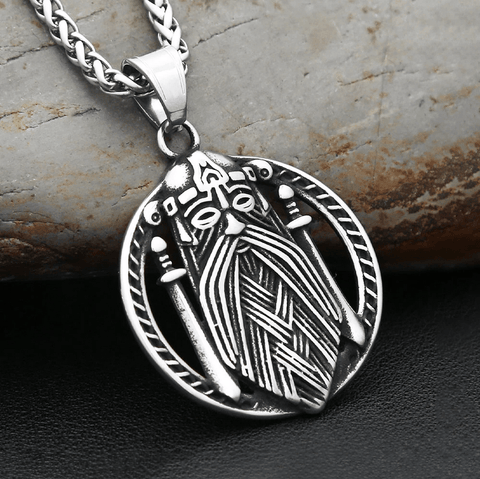 This striking necklace features the face of Odin, the one-eyed god of knowledge, framed by crossed Viking swords — a symbol of divine strength and fearless leadership. Every detail captures the spirit of the ancient North: wisdom, courage, and the will to conquer.