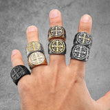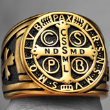 Show your faith and make a bold statement with the Saint Benedict Cross Ring! This stunning stainless steel ring is engraved with iconic latin phrases, honoring the holy father Benedict.