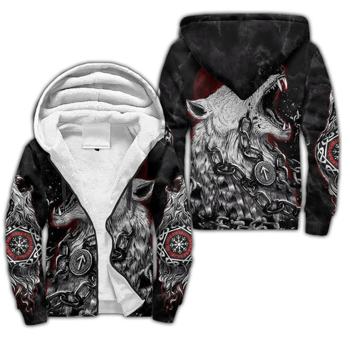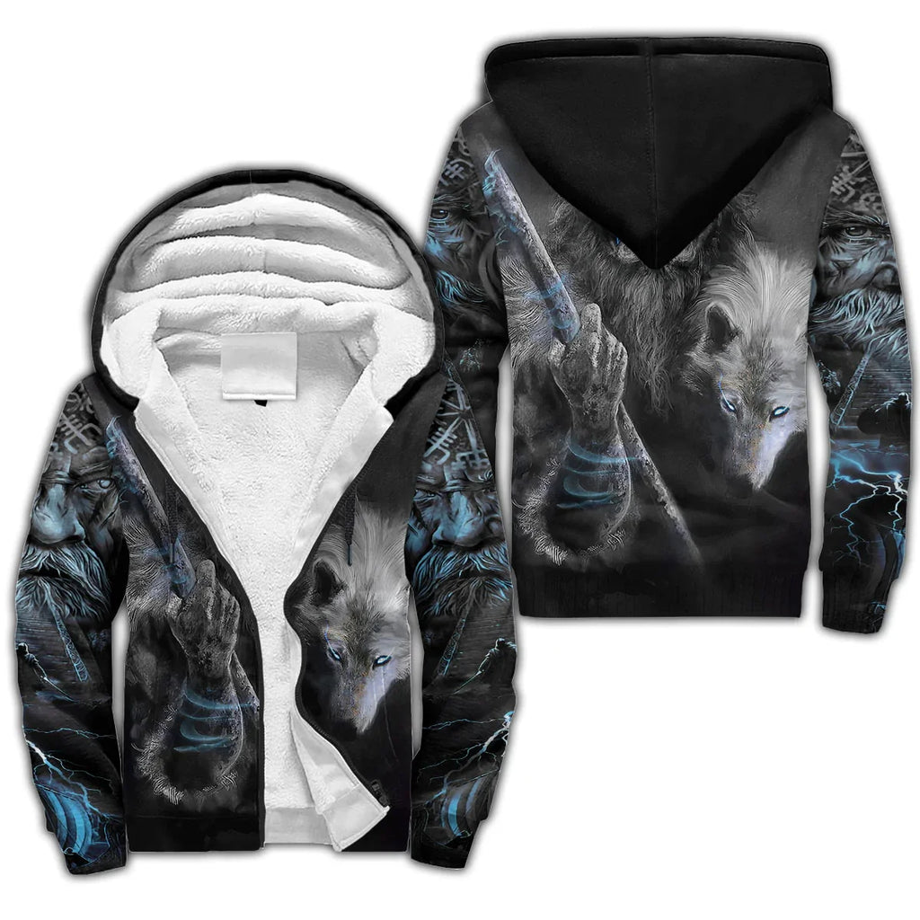Premium Viking Wolf Vegvisir zip hoodie featuring Norse compass symbol. Authentic Viking apparel with runic wolf design. Perfect for Norse mythology enthusiasts and pagan clothing lovers.