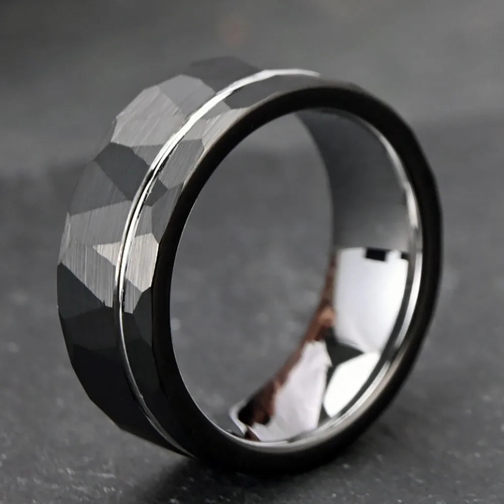 An exercise in refined minimalism, this tungsten carbide ring showcases a meticulously engineered polygon geometry in contrasting silver and gold tones. The faceted surface reflects light with architectural precision, while tungsten's renowned hardness guarantees enduring brilliance resistant to the wear of daily life. Its substantial presence on the finger conveys quiet confidence—neither ornate nor austere, but deliberately considered. The dual-metal palette bridges contemporary design with heritage craftsmanship, making it equally at home as a personal talisman or a discerning collector's acquisition. A piece for those who understand that true luxury lies in intentional design and uncompromising material quality.