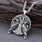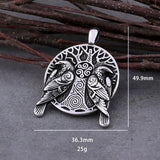 Nuestro collar de cuervos de Odín está hecho de acero inoxidable de alta calidad y representa dos grandes cuervos bajo el Yggdrasil, el árbol de la vida. Este colgante vikingo es un gran regalo para todos los fanáticos de la mitología nórdica y viene con dos obsequios GRATIS: