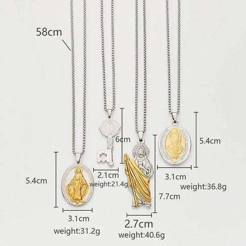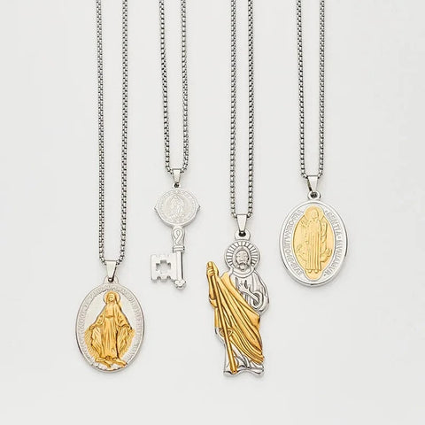 Carry divine protection and faith wherever you go with these Saint Benedict, St. Jude, and Virgin Mary Necklaces.